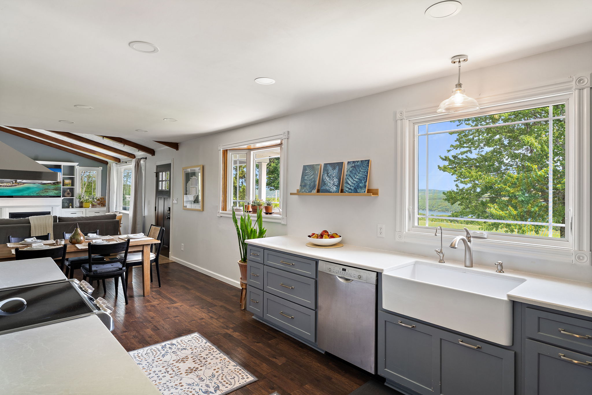 • Open kitchen, dining, and living area with panoramic lake views and fireplace.